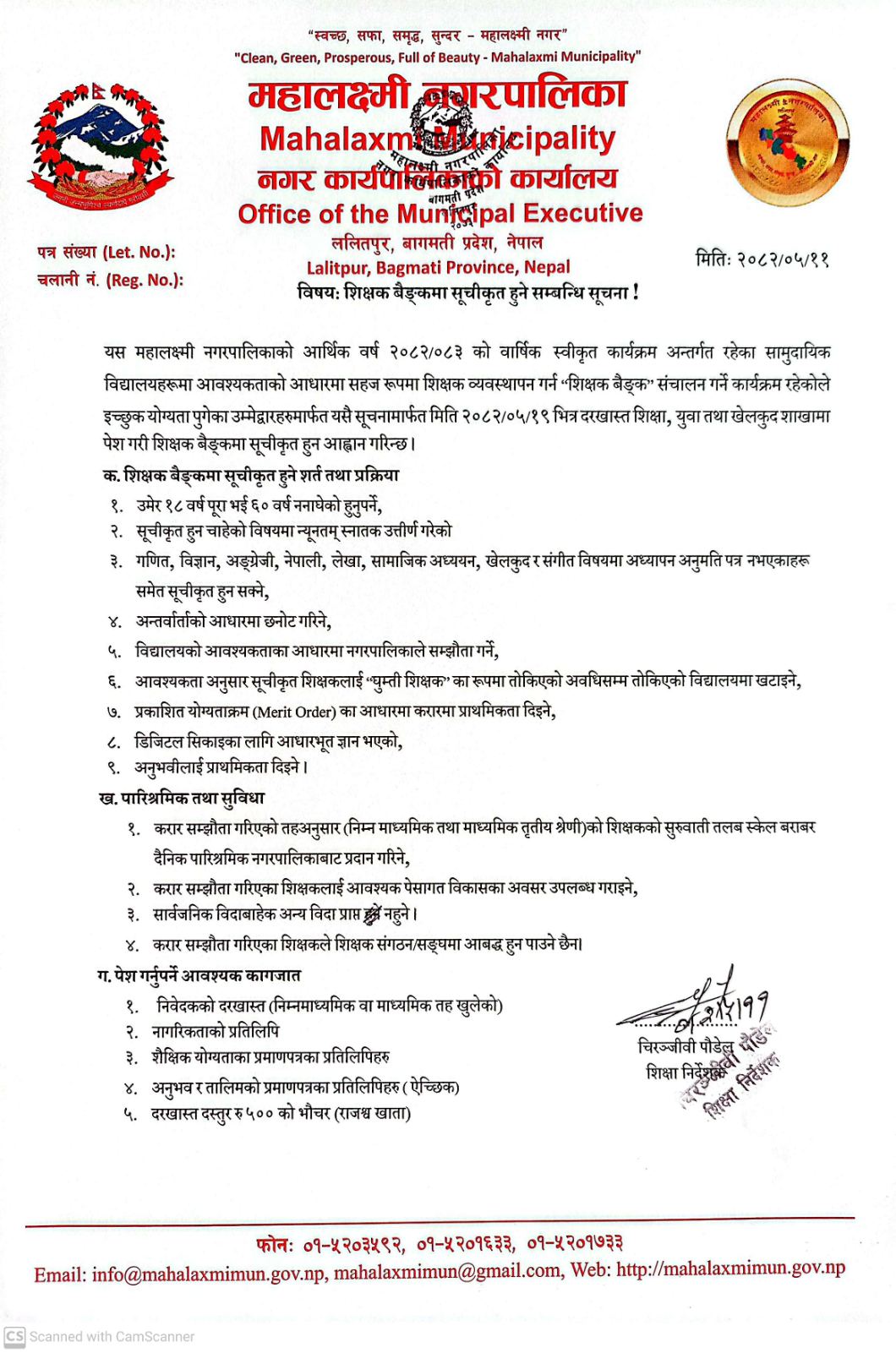 शिक्षक बैंकमा सुचिकृत हुने सम्बन्धी सुचना प्रकाशित मिति २०८२/०५/११